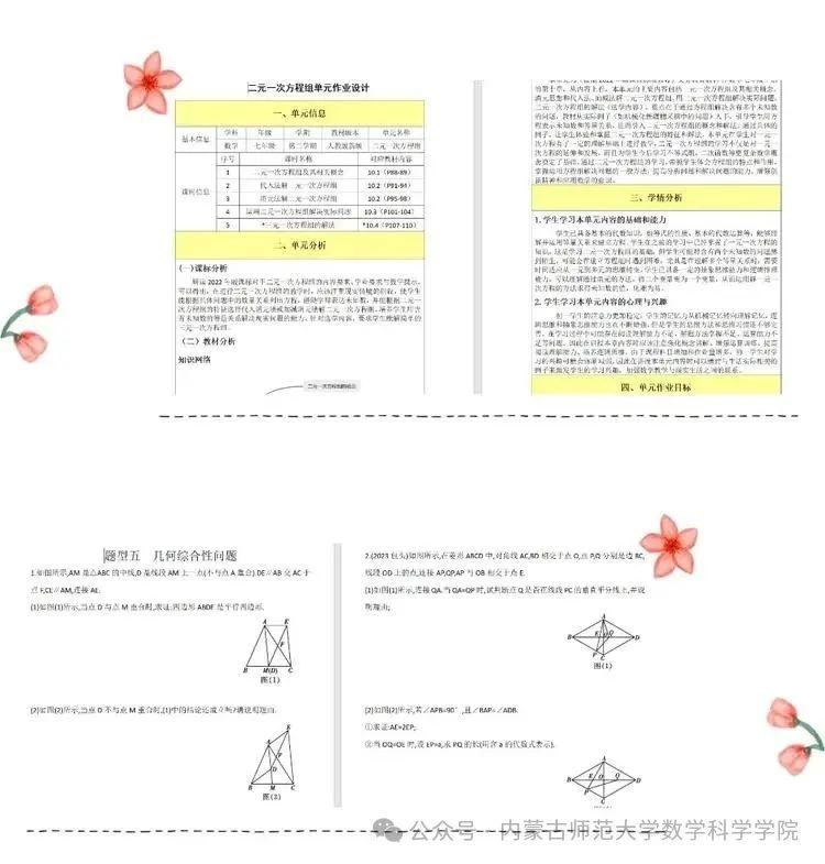 除了课堂教学和班主任工作,我还积极参与了学校的教研活动。我与其他数学老师一起,探讨教学中的各种问题,分享彼此的经验和心得。我参与设计了“第十章 二元一次方程组单元作业设计”以及“题型五 几何综合性问题”。在思维的碰撞中,我不断反思自己的教学实践,不断改进自己的教学方法,努力提升自己的教学水平。
