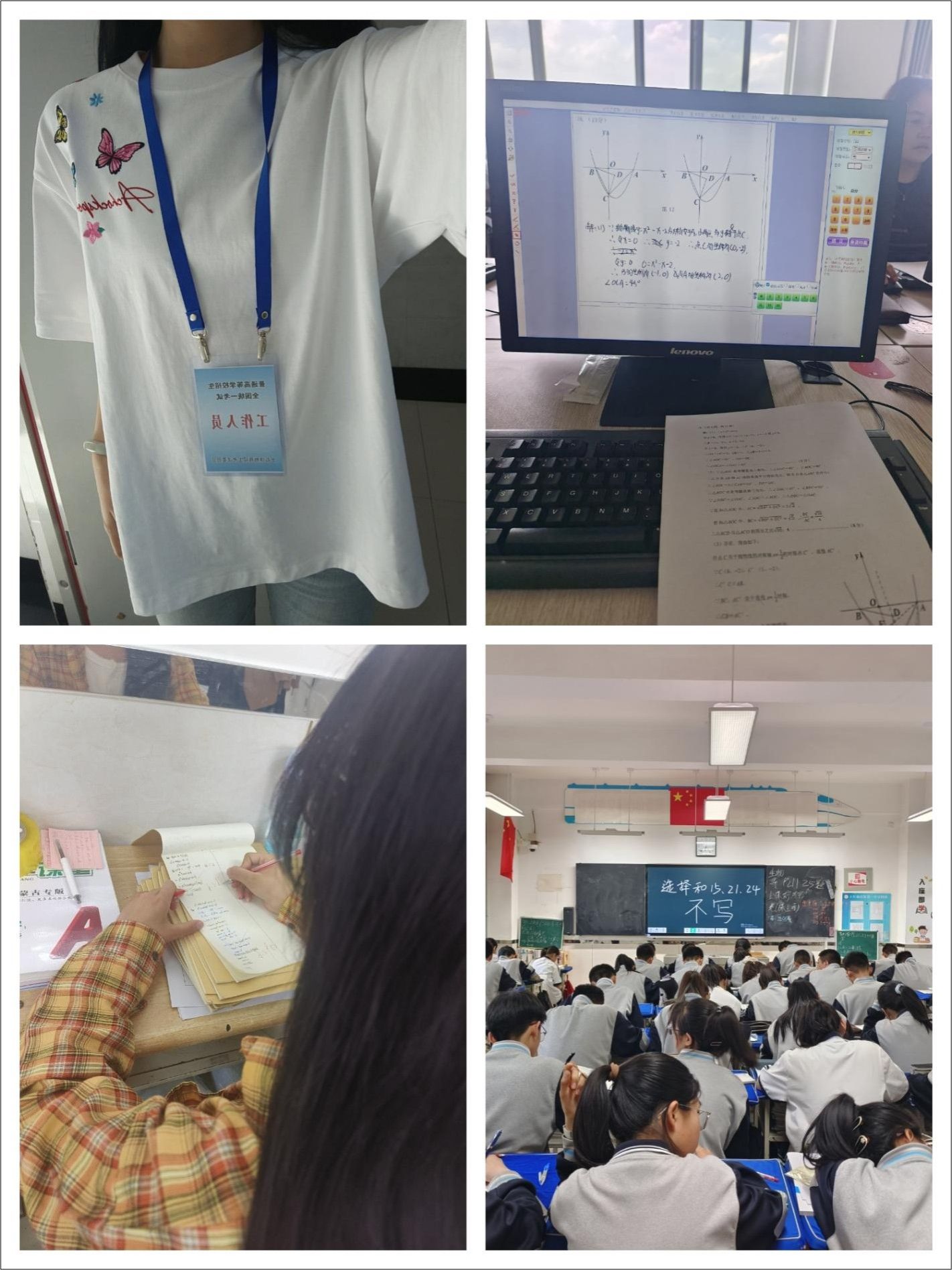 教师的日常远不止上课。民一中给了实习生非常多的锻炼机会,让我们能和老教师一同参与到学校其他工作中。在初二学生计算机考试中,我负责点名和带领学生进入考场的工作。虽然那天反反复复爬了十几次五楼,但是看着学生们敲击键盘的背影,我明白我的工作虽然微小,但却是维护了考试公平与秩序;加班判作业到腰酸背痛时,看着密密麻麻的红对勾和批注,我顿悟——那些在理论课本里读到的"教师奉献精神",突然具象成办公室总亮到深夜的灯,化成老教师案头永远温着的半杯浓茶。最有成就感的是电脑阅卷初三模考:我与老师们讨论每个得分点的赋值,一同分析考生的答案,或赞叹思路清晰,或惋惜失之毫厘。当系统显示“阅卷完成”时,盯着屏幕揉揉眼睛的瞬间,我突然觉得自己也是学校教育工作运转中重要的一环。课后服务监考小测时,看着学生们眉头紧锁,耳边纸页翻动似春蚕食叶,我不由得被他们的沉浸和认真感动……这些琐碎的温暖,都成了我实习生活里的小确幸。