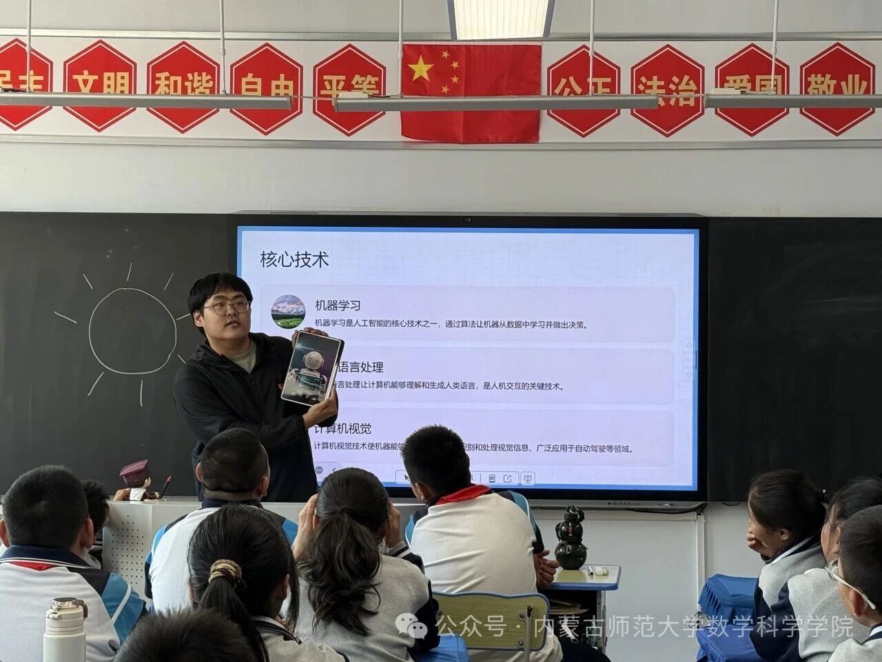 在和林格尔县乳业开发区第一小学,内蒙古科学技术普及学会兼职副秘书长、澳门pg官方电子平台博士研究生乌日乐等一群研究生科普志愿者,他们用所学的“数据科学与智能信息处理”“基础数学”“应用数学”等学科专业,用通俗易懂的语言,为小学生普及“人工智能是什么”“人工智能会做什么”“机器是怎样看懂图像的”,通过活动让学生积极体验,在活动中感知科技、思考未来、收获新知。