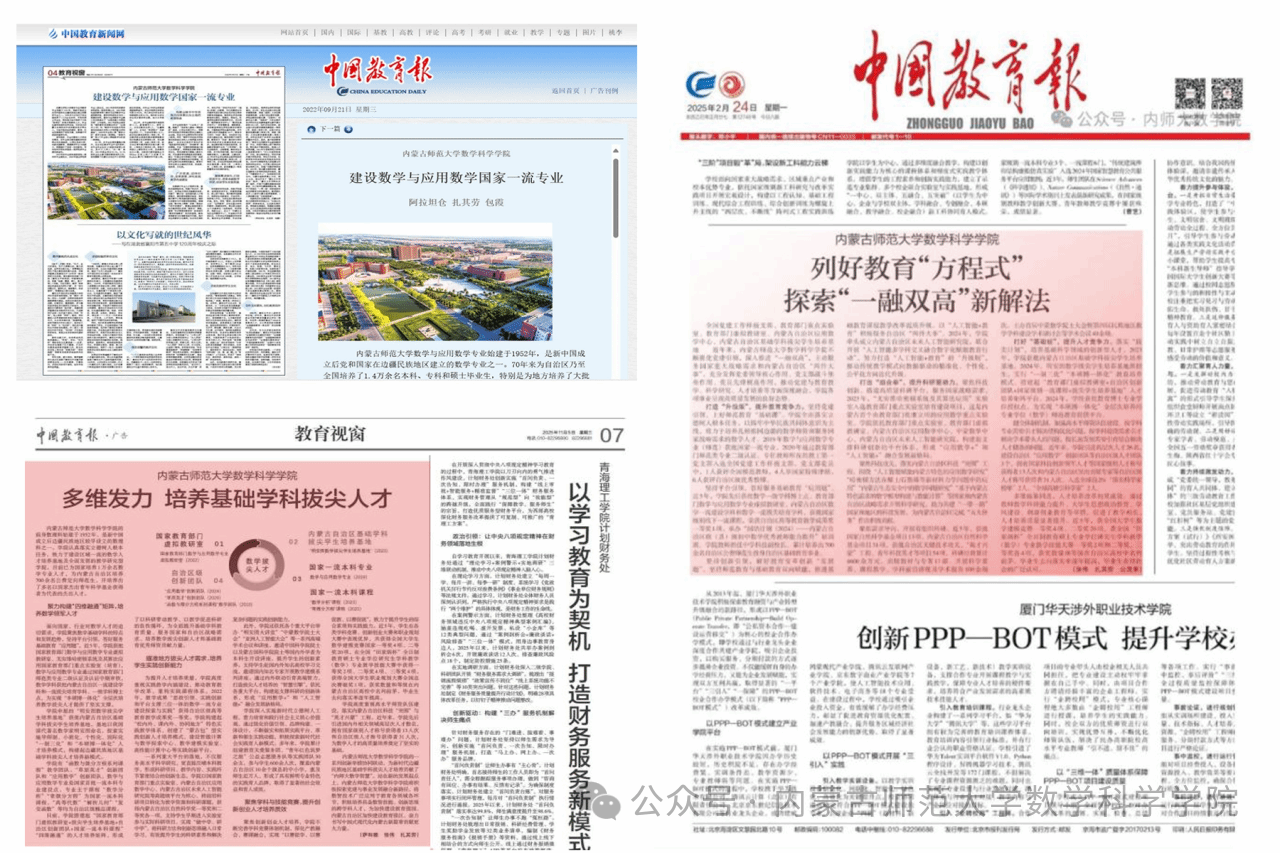 学院始终以育人为中心,教学和科研并重。2021年获批内蒙古自治区应用数学中心,2022年获批教育部虚拟教研室、自治区数学一流建设学科,2023年获批教育部重点实验室、自治区数学一流拔尖培育学科和自治区基础学科拔尖学生培养基地,至此构建起“教育部虚拟教研室+自治区创新团队+国家级一流课程+拔尖学生培养基地”四维融通的人才培育矩阵,形成了教学科研双融双促的良性循环,为全面提升教育质量、服务国家和自治区战略需求、培养数学创新人才和基础教育优秀师资贡献了应有力量。