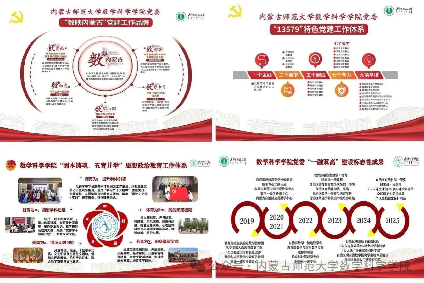 学院坚持和加强党对教育事业的全面领导,坚持大抓基层的鲜明导向,以党员有为、党支部有力、党建工作有效“三有目标”,构建以“数映内蒙古”为核心,以数智育英(教育部重点实验室数学教师团队党支部)、数智融蒙(内蒙古自治区应用数学中心教师团队党支部)、数心向党(本科生一支部)、数绘同心圆(本科生二支部)、数说蒙古马(硕士研究生支部、博士研究生支部)为载体的党建品牌矩阵。2025年10月,学院党委被评为全区高校党建示范创建和质量创优工作“党建标杆院系”,1名博士荣获“研究生党员标兵”。