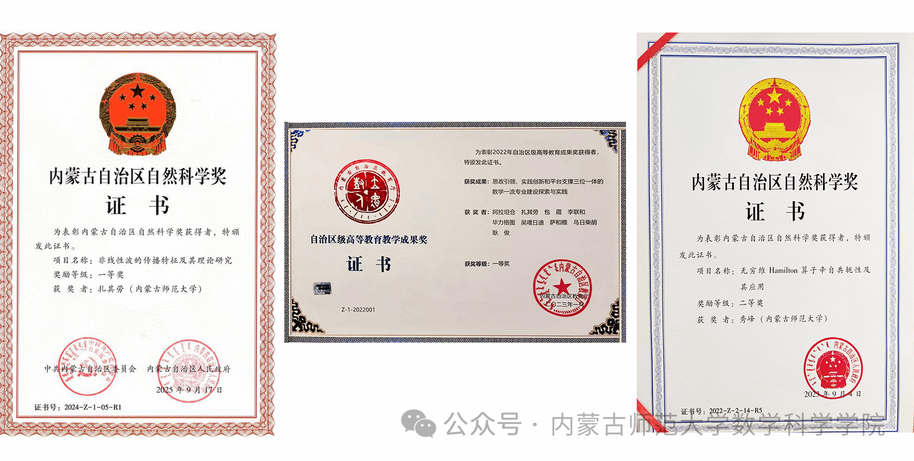 学院构建“学科+专业+课程”一体化生态系统,2019年获批国家级一流本科专业,2020年首批通过教育部门师范类专业二级认证,2021年获批数学一级学科博士点。2022年《思政引领、实践创新和平台支撑三位一体的数学一流专业建设与实践》荣获内蒙古自治区高等教育教学成果奖一等奖。《数学分析》《常微分方程》等课程先后获批国家级线下一流课程,形成完整优质课程体系。