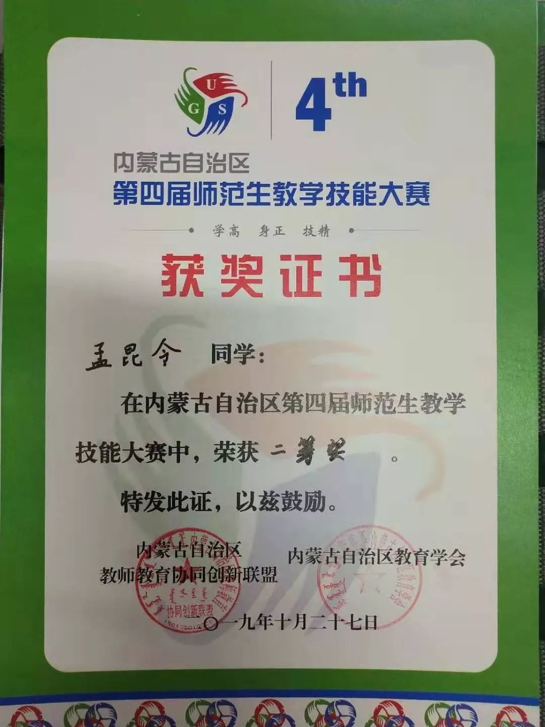 在于2019年10月25日至28日举办的内蒙古自治区第四届师范生教学技能大赛中,澳门pg官网尼日嘎拉同学获得数学与应用数学(蒙古语)组一等奖;哈布日同学获得数学与应用数学(蒙古语)组二等奖;孟昆令同学获得数学与应用数学(汉语)组二等奖;王亚菲同学获得数学与应用数学(汉语)组优秀奖。