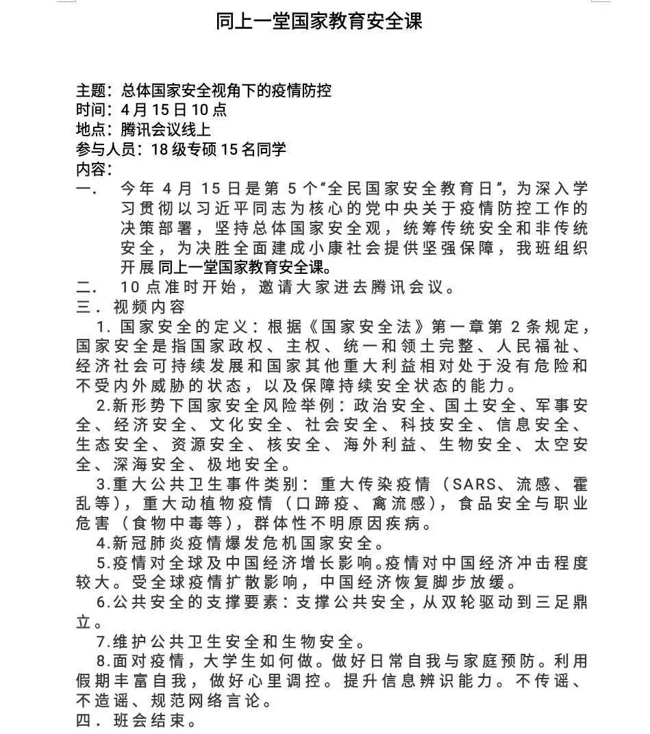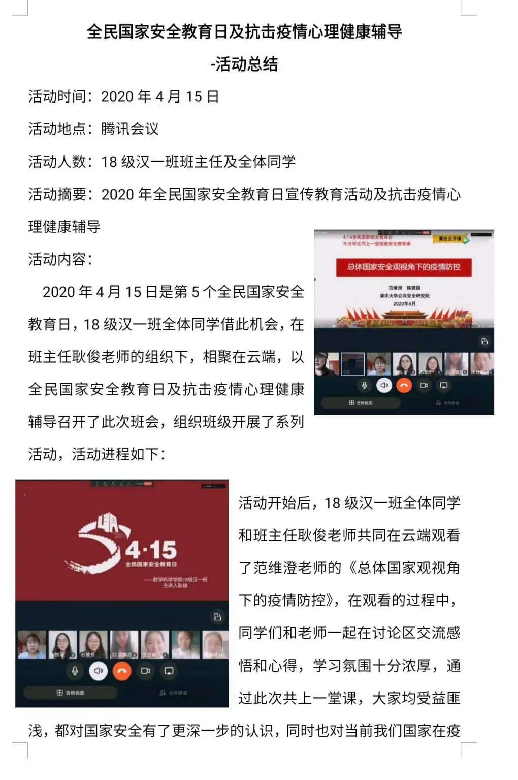 全民国家安全教育日(National Security Education Day)是为了增强全民国家安全意识,维护国家安全而设立的节日。为深入学习贯彻以习近平同志为核心的党中央关于疫情防控工作的决策部署,坚持总体国家安全观,响应国家安全教育,澳门pg官网各班级围绕“增强国家安全意识”召开主题“云”班会进行学习和交流。