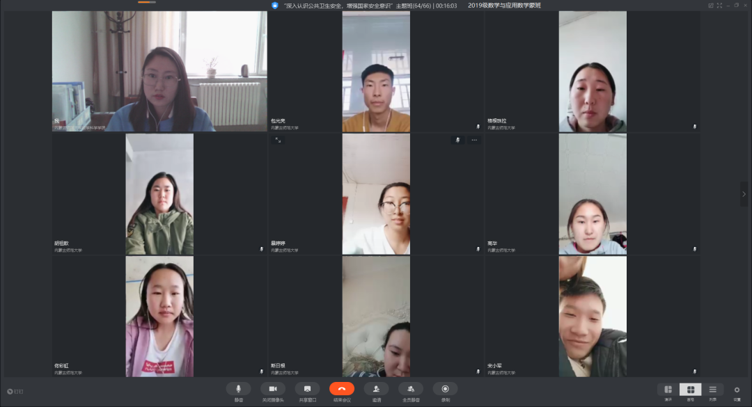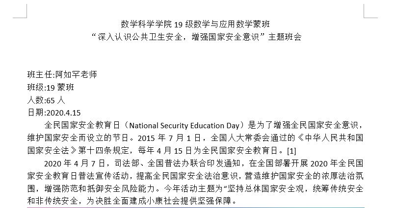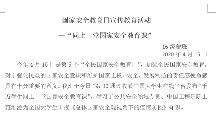 2020年4月15日是第5个“全民国家安全教育日”,为深入学习贯彻以习近平同志为核心的党中央关于疫情防控工作的决策部署,引导学生将总体国家安全观贯穿抗疫全过程,提升维护国家安全的自觉性和主动性。澳门pg官网组织学院各班级通过各类网上交流平台开展“国家安全教育”为主题的线上主题班会。同学们共看国家安全教育公开课,并积极进行讨论。