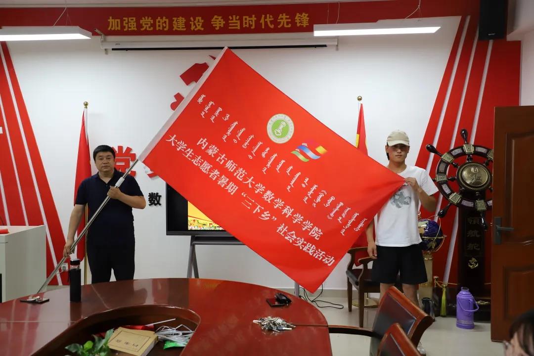 澳门pg官网党委副书记、副院长季建光老师为志愿者代表19级蒙班邰心同学授旗。