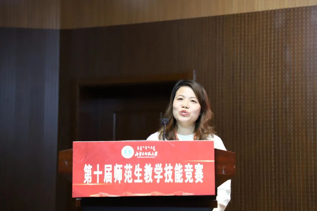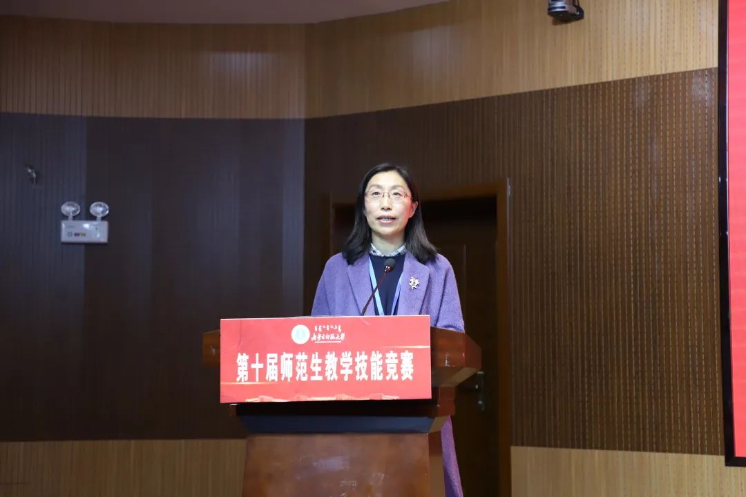 徐宝芳教授肯定了大赛各负责人员的辛勤付出,并说明了大赛对于学校、学院以及个人具有积极的影响,最后徐宝芳教授希望同学们能够积极参加即将到来的自治区级师范生教学技能竞赛,继续相互借鉴学习。