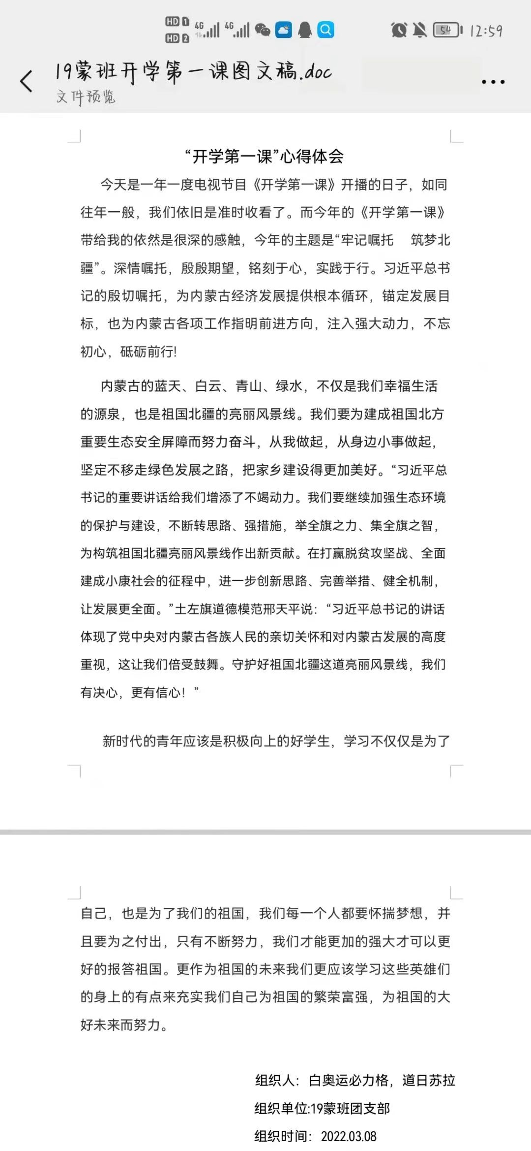 “开学第一课”注重学生引导认真学习、用心感受、深入思考、让党史教育爱国主义教育、民族团结进步教育入脑入心,真正达到启智润心的效果。通过本次观看,希望同学们能够深刻认识“牢记嘱托,筑梦北疆”的内涵与实质,肩负起属于青年人的责任担当以及历史使命,出色完成学业,锻炼自身本领,不断提高内核,努力成为新时代的有力建设者。