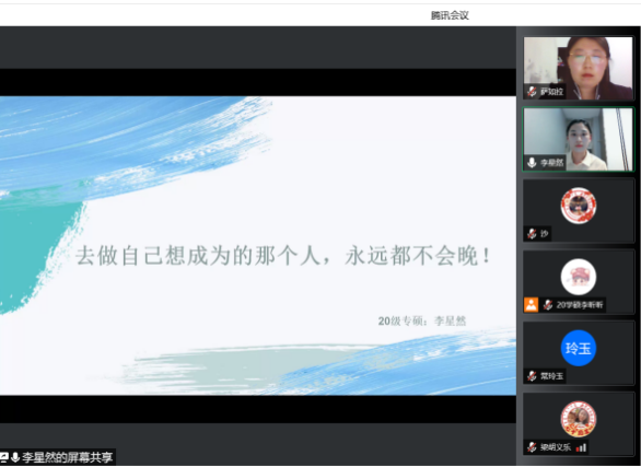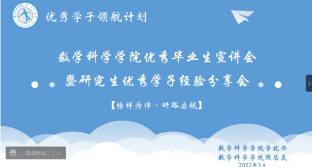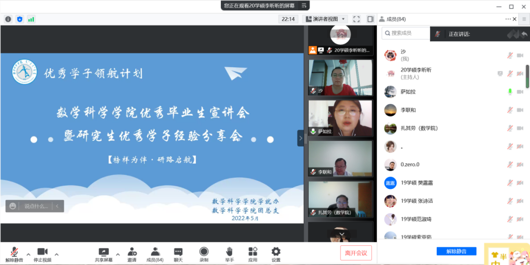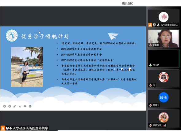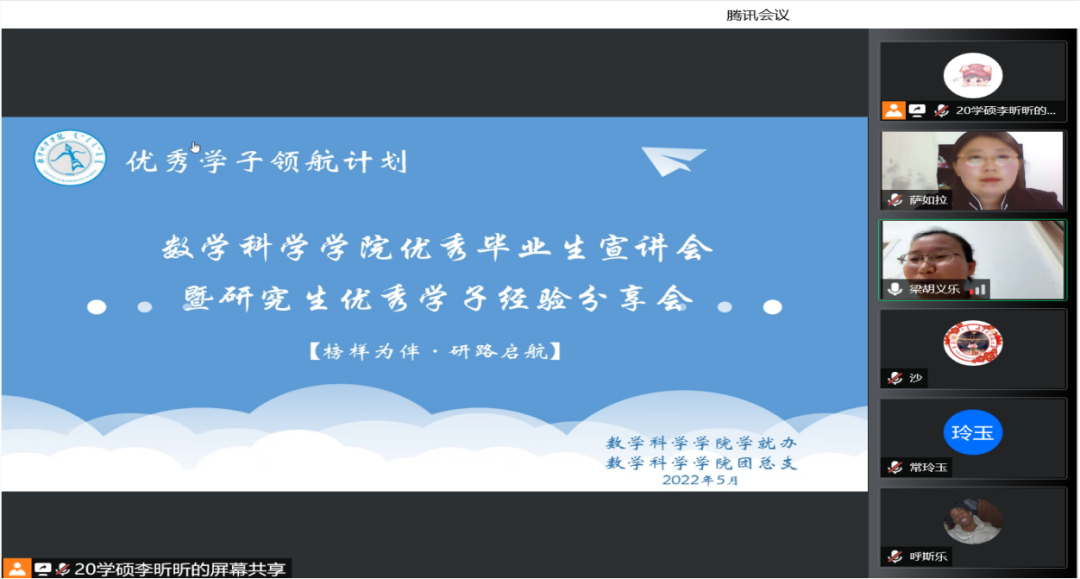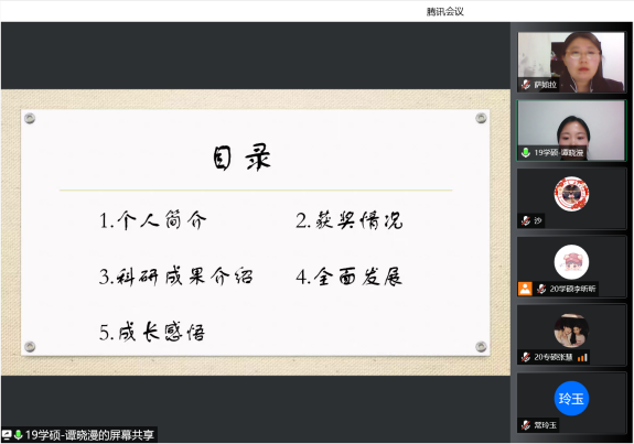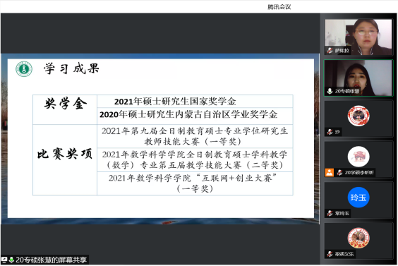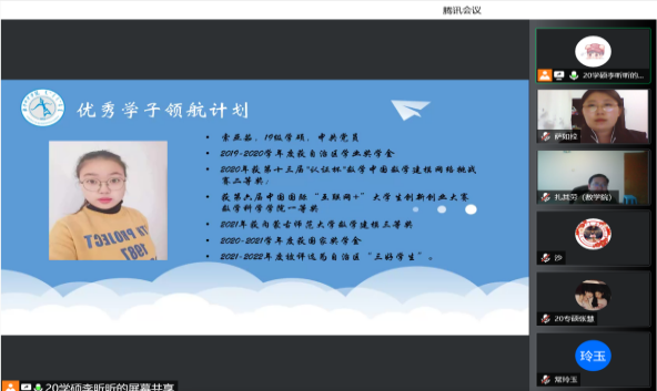 为了充分发挥研究生优秀学子的示范引领作用,更好地落实《澳门pg官方电子平台关于开展“榜样为伴·研路启航”研究生国家奖学金获得者事迹宣传活动的通知》《内蒙古自治区教育厅关于报送2022年春季学期研究生教育教学典型案例的通知》《关于组织开展澳门pg官方电子平台“学生劳动教育宣传月”活动的通知》等文件要求,澳门pg官网于5月23日晚,组织全体研究生开展“澳门pg官方电子平台优秀毕业生宣讲会暨研究生优秀学子经验分享会”,邀请澳门pg官网2021年度国家奖学金获得者索亚茹、张慧,2021年度自治区奖学金获得者孙天娇、谭晓漫,2021-2022年度自治区“优秀毕业生”李星然、“三好学生”索亚茹,共5名优秀学子为大家分享自己学习生涯中的经验和感悟。