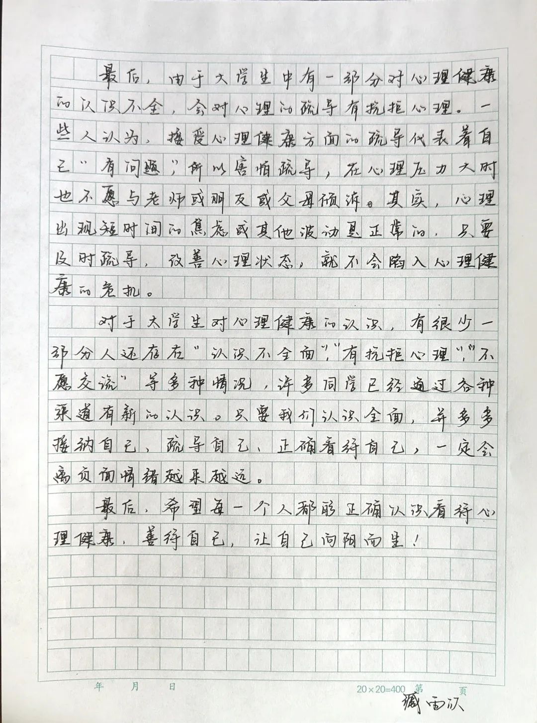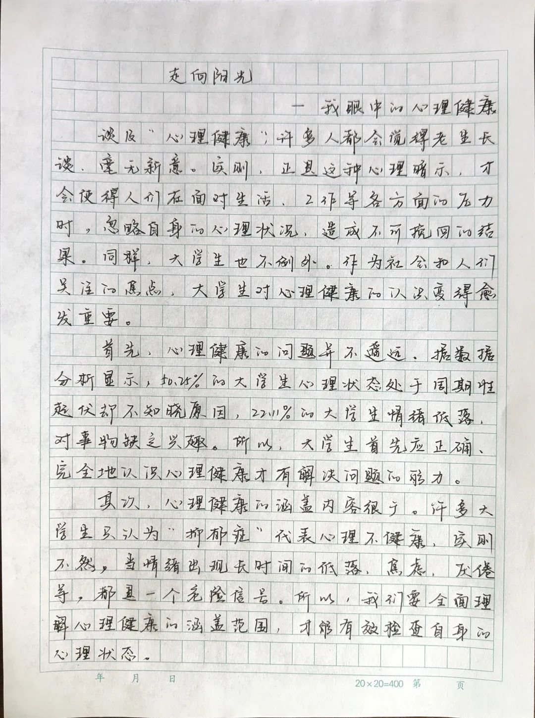 为提升心理育人质量,增强大学生心理调适能力,澳门pg官网开展了“我爱我”心理健康征文活动。此次征文活动共86人参加,同学们从个人成长经历分享(自己的心理变化以及相关的收获或感悟)、我眼中的心理健康(谈及大学生对心理健康的认识)、我与心理健康(自己参与过的心理健康活动相关的经历)等方面,通过用笔端的表达方式,抒发了自己对心理健康的见解,以下是部分文章: