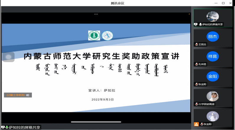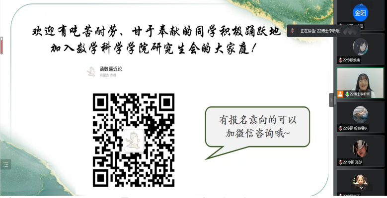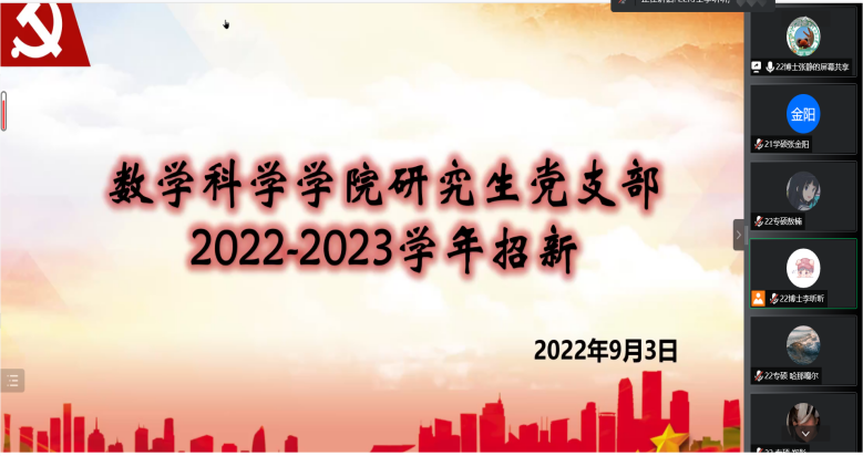2022年9月3日晚20:30,澳门pg官网举办了线上新老生见面交流会,两校区全体研究生参加此次活动,活动由20级学硕李昕昕同学主持。张静同学、李颖同学、李昕昕同学分别对学院研究生党支部、研究生团支部、研究生会分别做了介绍及招新安排,同时希望同学们积极参加学生组织,在学习生活之余提升自己各方面能力。