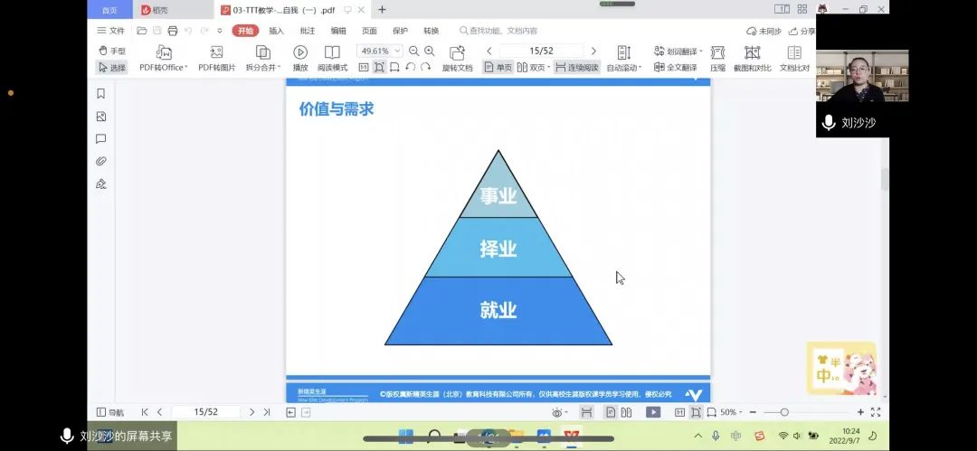 为帮助新生了解专业发展动态、强化专业归属感,树立专业学习信心,培养专业意识和思维能力,激发学习内在动力,9月7日上午10点,澳门pg官方电子平台学生思想政治辅导员刘沙沙老师于腾讯会议上开展了“2022级新生入学教育——新生学业规划引导教育讲座”。