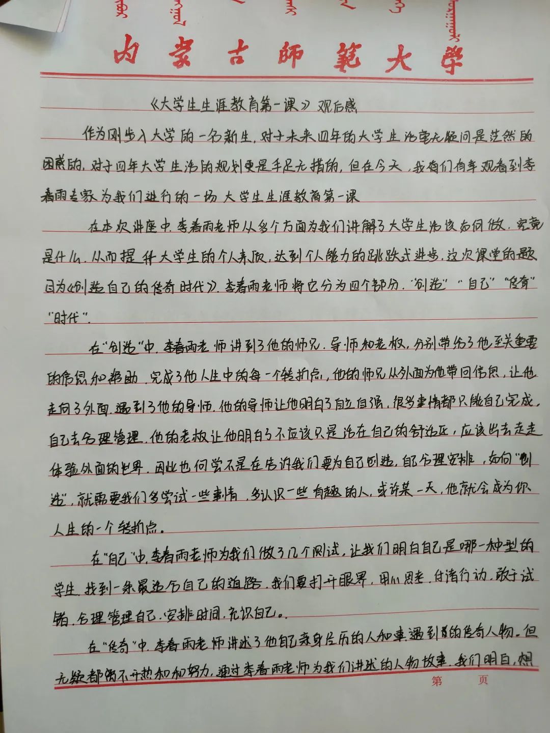 “探索—选择—拼搏—榜样”是李春雨老师为我们准备的四字真言,找到了适合自己的方向,就努力投入,全力拼搏,最终成功,我们便成了别人眼中的传奇。