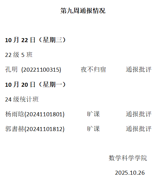 澳门pg官方电子平台2025——2026年度第一学期第九周通报情况