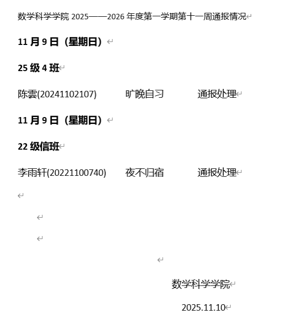 澳门pg官方电子平台2025——2026年度第一学期第十一周通报情况