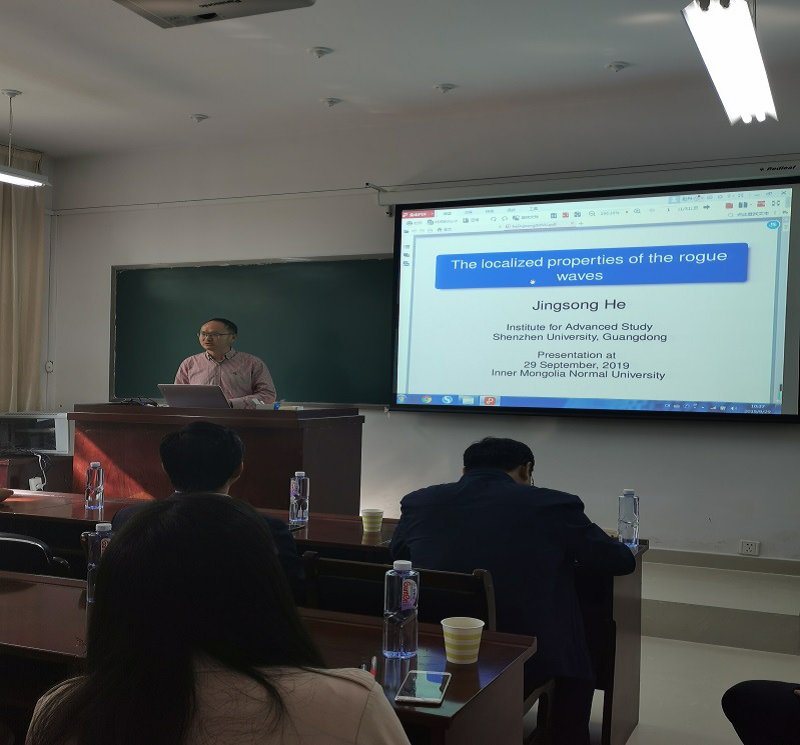 2019年9月29日,深圳大学高等研究院贺劲松教授、青海师范大学数学系加羊杰博士应邀为澳门pg官网师生作学术报告。报告由扎其劳教授主持,澳门pg官网 20余名师生参加了报告。贺劲松教授报告题目为“The localized properties of the rogue waves”,引入怪波“来无影、去无踪”的特征,说明它关于时间和空间是局域的。通过详细讨论复mKdV 方程 和Kundu-Eckhaus方程的怪波的长度、宽度和面积,定量刻画了所得怪波的局域化性质。同时,介绍了相关怪波研究的一些新进展。