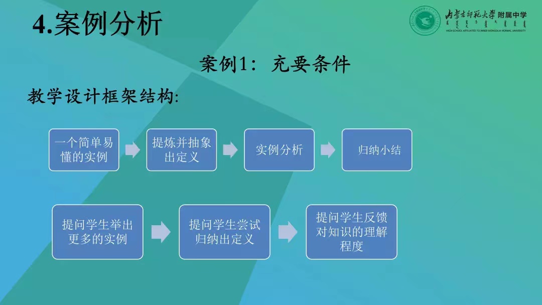 在给出如何备课的理论基础后,张生老师以《充要条件》和《两角和与差的正切公式》这两个真实案例向我们具体的展示了他是如何“用艺术的眼光备课”的。张生老师备课思路灵活又严谨,不乏趣味性,完美地体现了“用教材教”而不是“教教材”,每每到课堂的最后,总以精美的数学诗句、押韵的语句等提炼整节课的核心知识方法与思想,他的课如一个个艺术品一样,赏心悦目的同时,又能让学生满载而归。