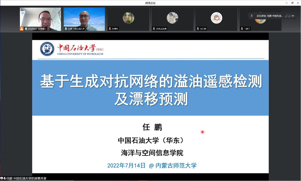 2022年7月14日上午8:30-10:00,澳门pg官方电子平台以线上会议的形式举办了迎校庆70周年暨内蒙古自治区应用数学中心系列讲座。特邀请中国石油大学(华东)教授,博士生导师,青岛市“海洋灾害预防检测信息国际联合研究中心”主任任鹏作了题目为“基于生成对抗网络的溢油遥感检测及漂移预测研究”的报告。本次讲座由高性能计算中心主任萨和雅主持,相关方向的教师、研究生和本科生听了本次报告。