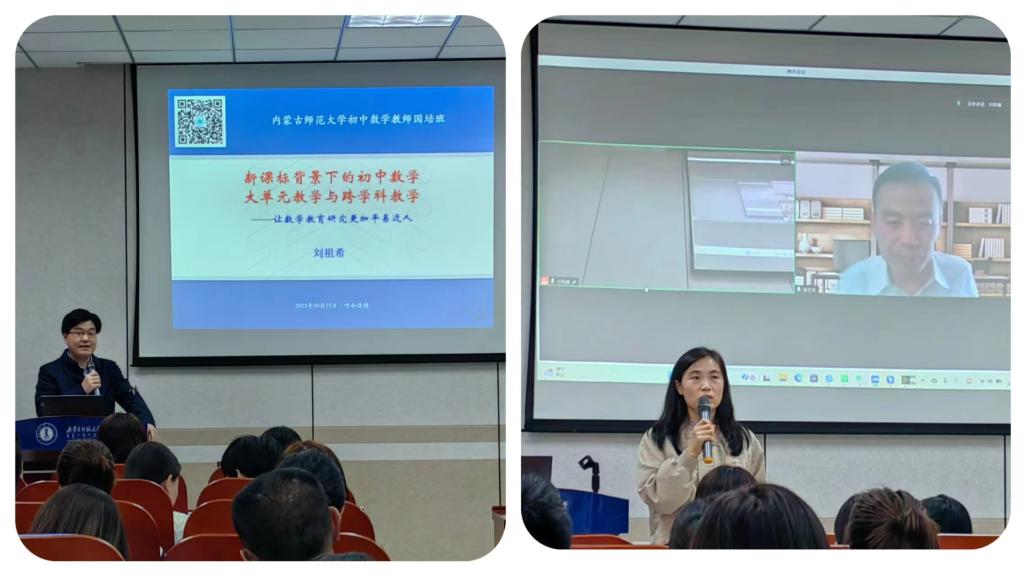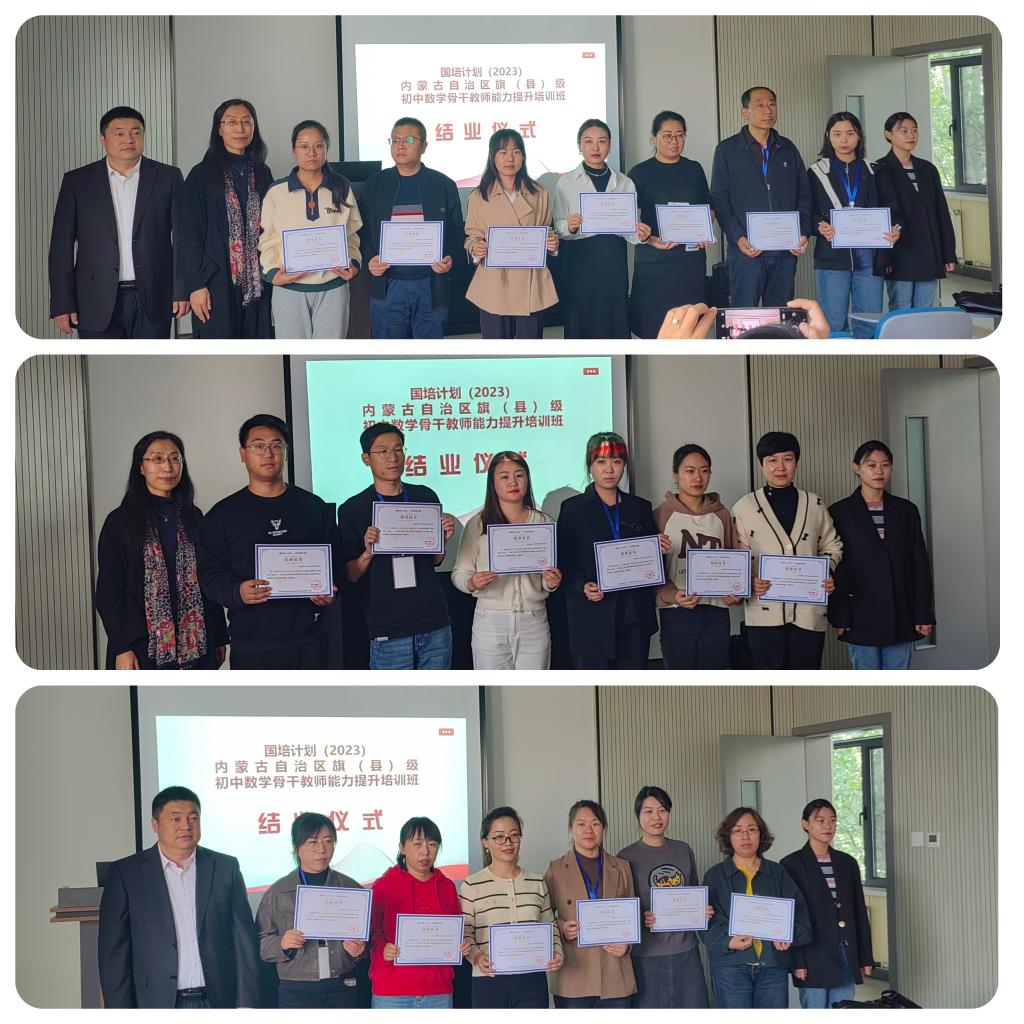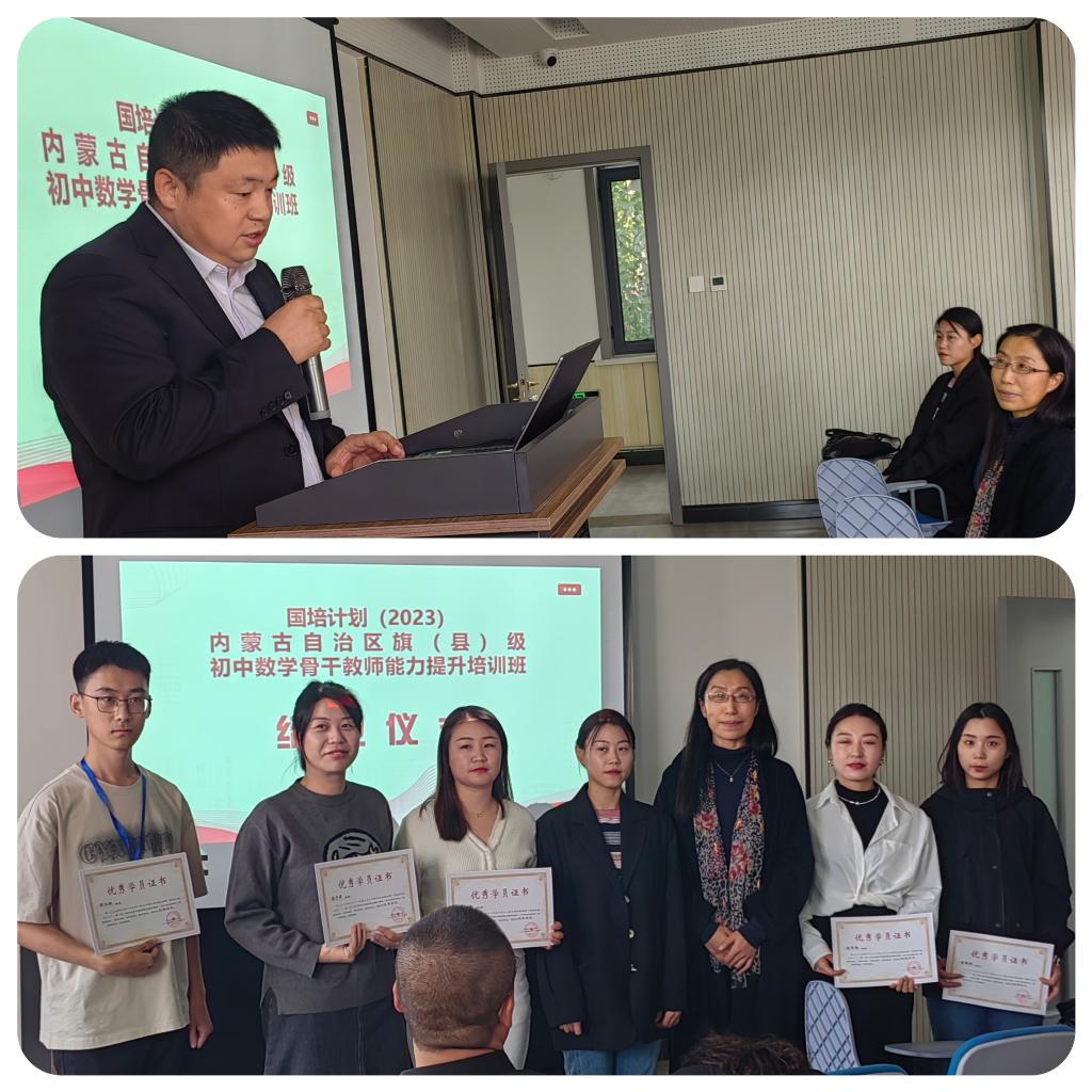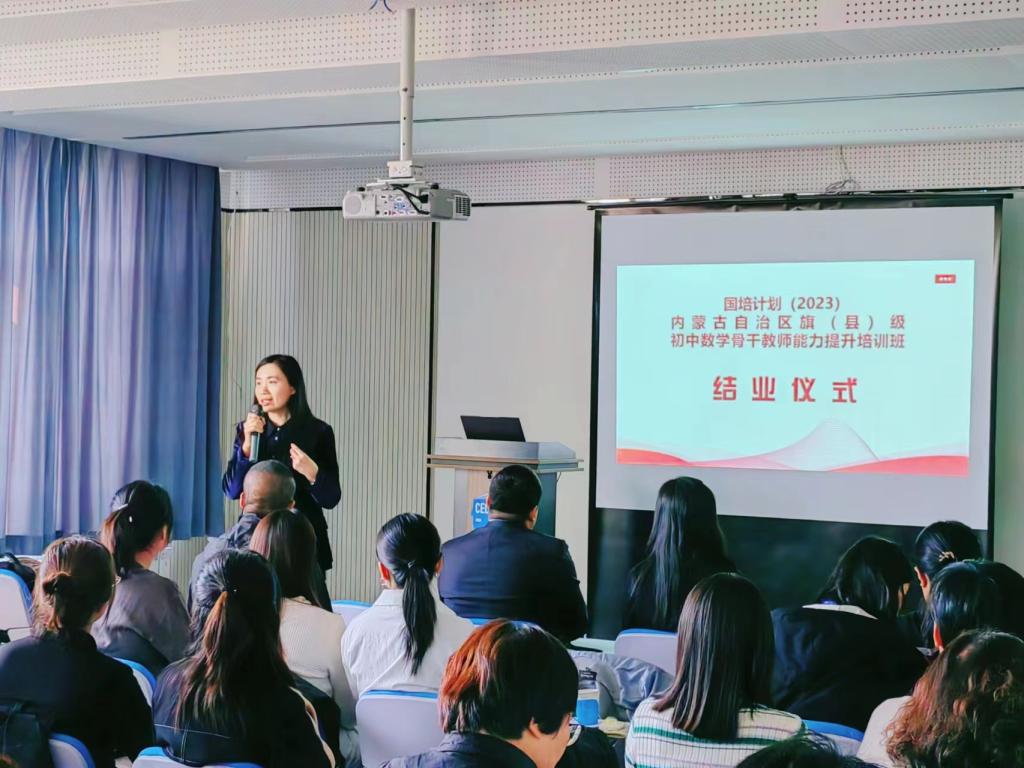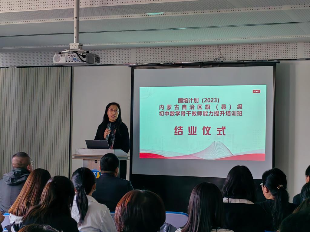 10 月 23 日下午 “国培计划(2023)——内蒙古自治区旗(县)级初中数学骨干教师能力提升”培训在澳门pg官方电子平台圆满落幕。本次培训由澳门pg官方电子平台继续教育学院主办,澳门pg官方电子平台承办,为期14天,含集中研修7天和跟岗实践7天,50名学员来自全区各盟市选派来的旗(县)级初中数学骨干教师。继续教育学院培训部薛佳琦老师、澳门pg官方电子平台副书记季建光老师、培训项目负责人数学科学院副院长包霞老师、培训项目对接人数学科学院李春兰老师、培训班班主任及相关工作人员出席了结业典礼。李春兰老师主持了结业仪式。