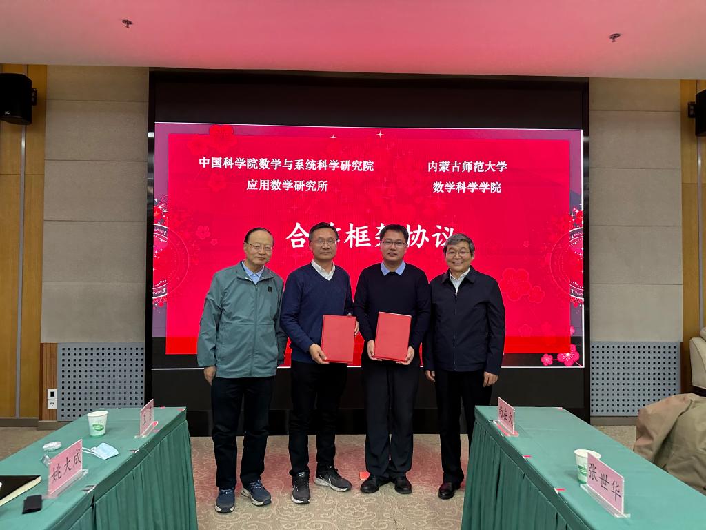 11月25日,澳门pg官网与中国科学院数学与系统科学研究院应用数学研究所在中国科学院联合召开应用数学学术交流研讨会并签署合作框架协议。中国科学院马志明院士、严加安院士、中国科学院前副院长巩馥洲研究员、数学研究所所长尚在久研究员、应用数学研究所所长骆顺龙研究员、应用数学研究所副所长王益研究员等40余名专家学者参加了本次会议。内蒙古自治区应用数学中心主任阿拉坦仓教授、澳门pg官方电子平台党委书记陈宏研、副院长包霞等教师参加了本次会议。学术交流研讨会由骆顺龙所长和包霞副院长主持。