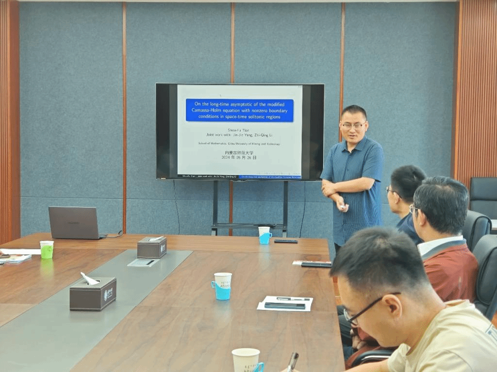 田守富教授报告的题目为“On the long-time asymptotic of the modified Camassa-Holm equation with nonzero boundary conditions in space-time solitonic regions”。田教授介绍了了其研究团队近期学术研究成果,详细讲解了mCH方程在具有相位点区域和不具有相位点区域的Cauchy问题的长期渐近行为,解释了mCH方程的解可以表示为离散谱上的孤立子解,连续谱上的前导项以及残差。