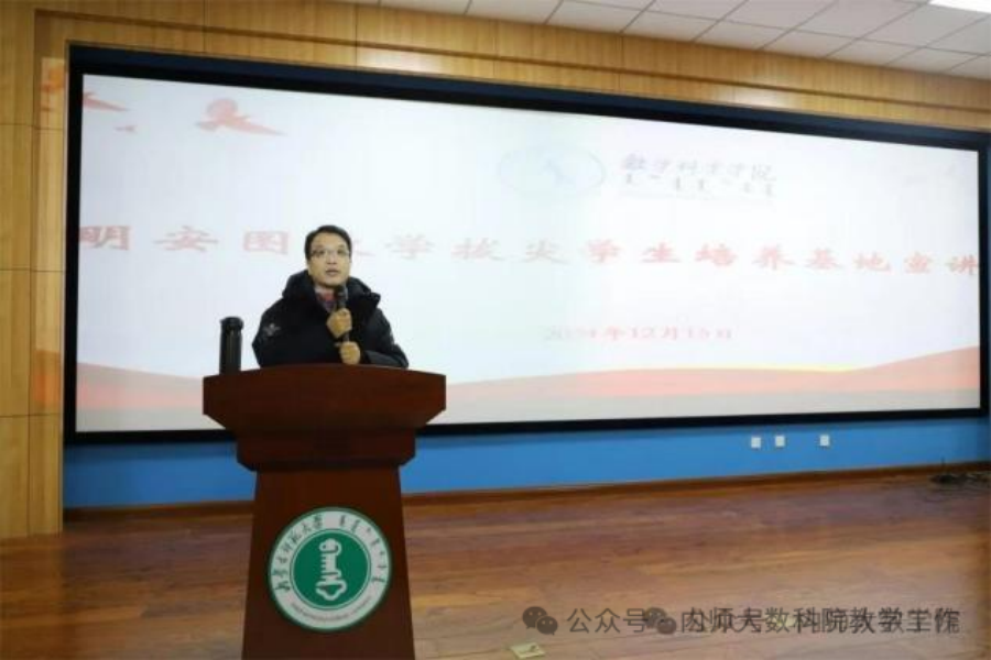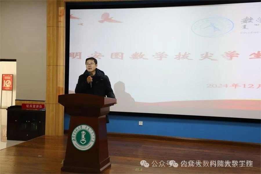 12月15日,澳门pg官方电子平台在学生事务中心一楼107报告厅开展“明安图数学拔尖学生培养基地”(以下简称明安图数学基地)招生选拔宣讲会。学院党委书记张伟、院长扎其劳出席会议并讲话。2024级数学与应用数学(非定向)、信息与计算科学、统计学三个专业学生与班主任参加会议。会议由学院副院长萨和雅主持。