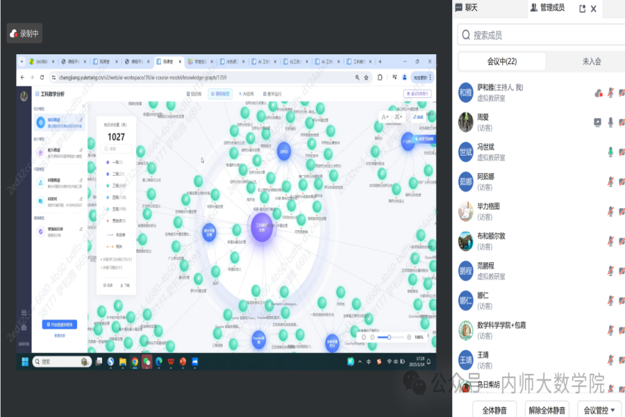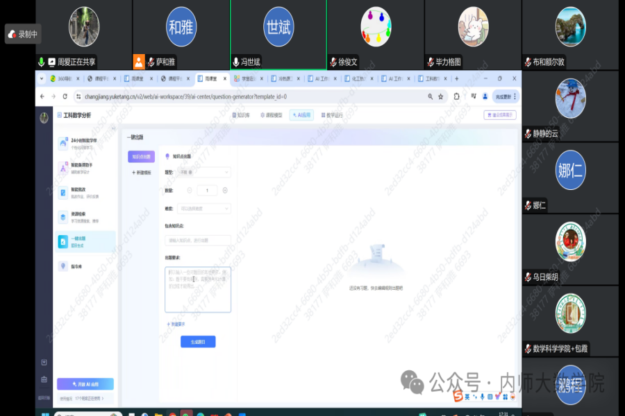1月15日下午,澳门pg官方电子平台为加强虚拟教研室的建设,丰富教研活动,特邀学堂在线的技术人员举办了一场关于AI数学课程建设的分享会。此次报告学院校级及以上一流课程团队的成员以及20余位拟建设一流课程的教师参与,会议由学院副院长萨和雅主持。