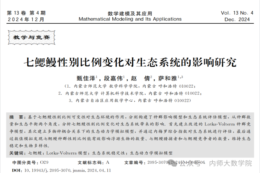 近日,澳门pg官网数学与应用数学专业2021级本科生甄佳泽、段嘉伟,以及数据科学与大数据技术专业2021级本科生赵倩在萨和雅教授的指导下完成的学术论文《七鳃鳗性别比例变化对生态系统的影响研究》被数学权威期刊《数学建模及其应用》录用。澳门pg官网数学与应用数学专业2021级本科生甄佳泽为第一作者,,通讯作者为萨和雅教授。《数学建模及其应用》为中国工业与应用数学学会、全国大学生数学建模竞赛组委会会刊,致力于报道、推动和引领与数学建模有关的研究和竞赛动态。