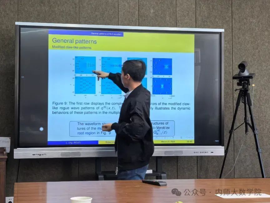 凌教授在报告中详细介绍了非线性薛定谔方程的怪波模式分类问题、分类方法及团队选择Darboux变换来推导怪波模式的思路、关键点、关键点的处理方法、已取得的结果及扩展到其他可积模型的普适性问题。与会师生对报告内容及所提开发问题,进行了热烈讨论与展望。本次交流学习对于学院学科发展、研究生培养质量的进一步提高有很好的促进作用。