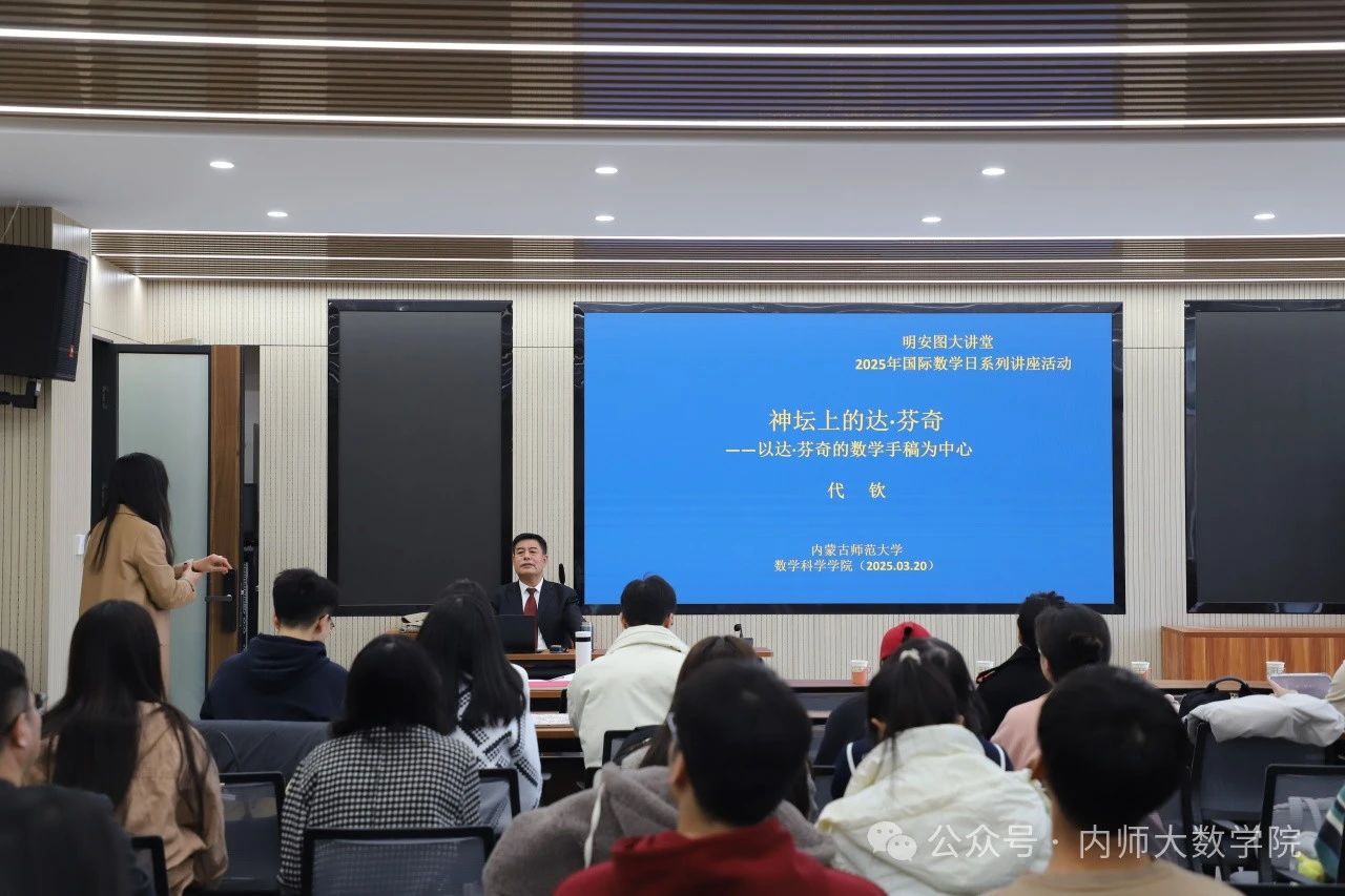 3月20日下午,澳门pg官方电子平台“3.14国际数学日系列活动”——明安图大讲堂第四讲在澳门pg官方电子平台盛乐校区内蒙古自治区应用数学中心报告厅进行。澳门pg官方电子平台科学技术史研究院代钦教授应邀作了题为“神坛上的达·芬奇——以达·芬奇数学手稿为中心”的学术讲座。澳门pg官网师生代表100余人聆听了本次讲座,讲座由包霞副院长主持。