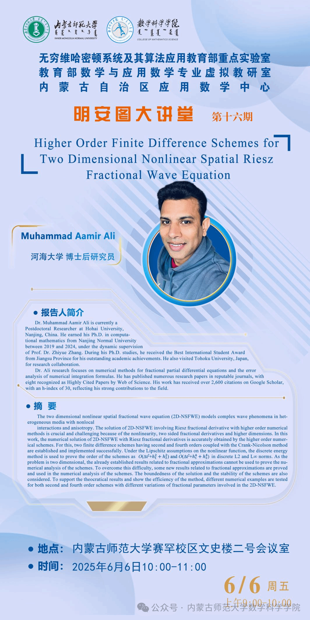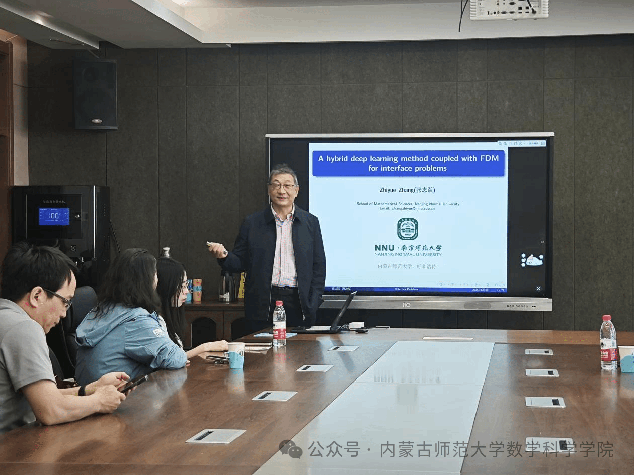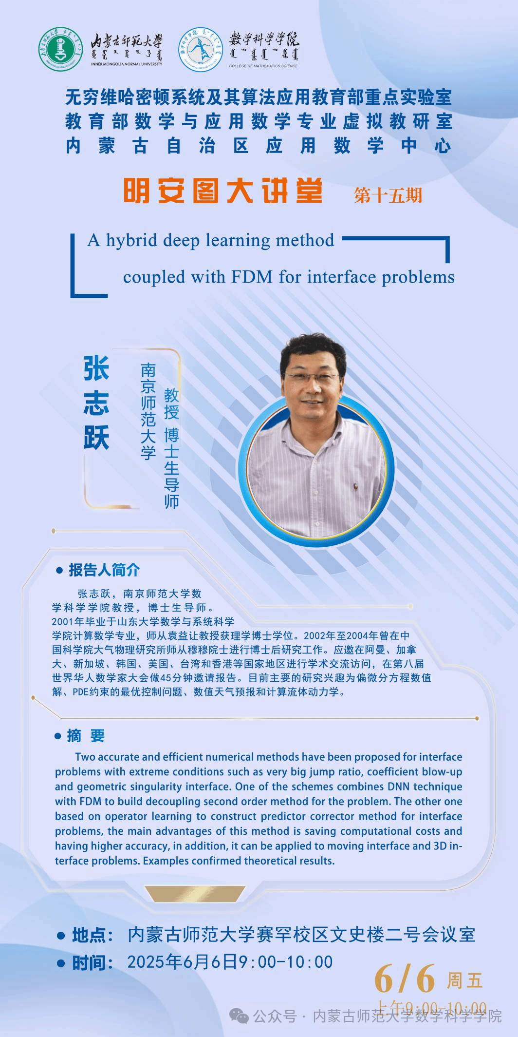 6月6日,澳门pg官方电子平台明安图大讲堂在澳门pg官方电子平台赛罕校区文史楼2号会议室成功举办。本次讲座特邀南京师范大学张志跃教授与河海大学博士后研究员ALI作专题学术报告。两场报告分别聚焦深度学习求解界面问题与分数阶微分方程的高精度数值方法,现场互动热烈。