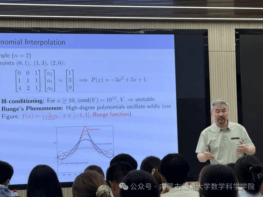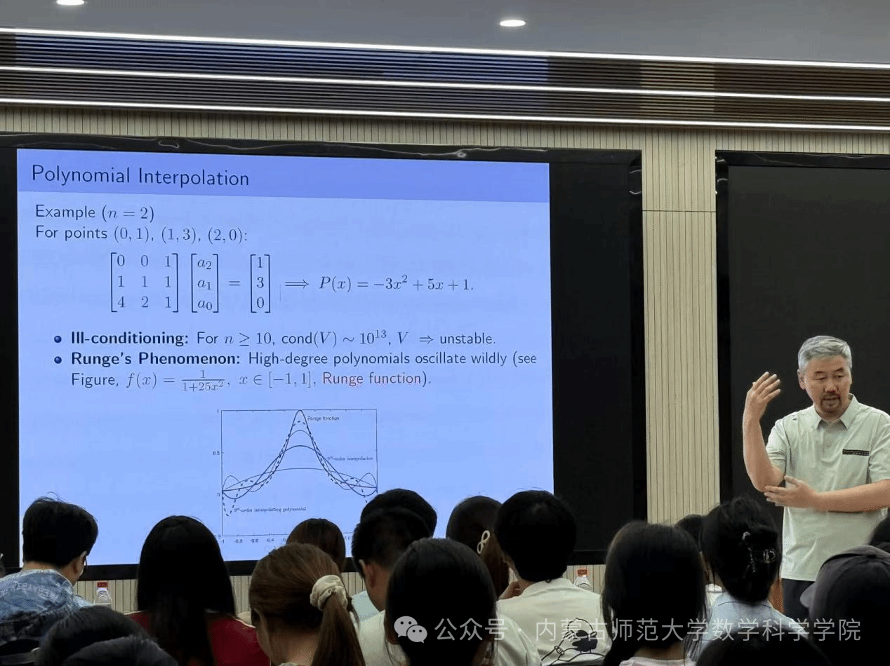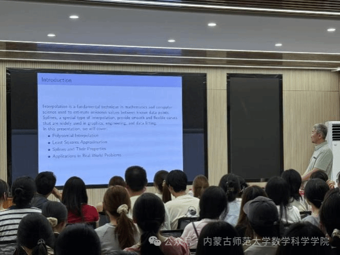 2025年7月4日,澳门pg官方电子平台在盛乐校区C区C301教室举办了明安图大讲堂,特邀蒙古国教育大学的Renchin-Ochir Mijiddorj教授,为在场师生带来了一场精彩的关于拉格朗日插值及多项式插值算法的科普讲座。此次讲座由澳门pg官方电子平台副院长萨和雅主持,2025年数学建模暑期培训班的全体学员参与了此次交流学习。