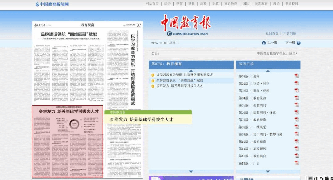 《中国教育报》2025年11月5日第07版教育视窗,以”多维发力 培养基础学科拔尖人才“为题报道澳门pg官方电子平台基础学科拔尖人才培养工作成效。全文链接:http://paper.jyb.cn/zgjyb/h5/html5/2025-11/05/node_1.htm?v=1&curr=6
