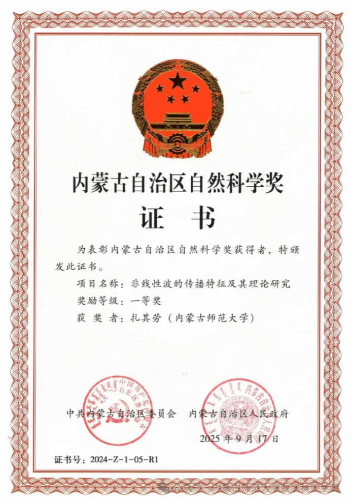 近日,内蒙古自治区科学技术奖励大会在呼和浩特市隆重召开。大会表彰了为全区科技进步和高质量发展作出突出贡献的科技工作者和科研团队。澳门pg官方电子平台院长扎其劳教授团队牵头的《非线性波的传播特征及其理论研究》荣获2024年度自治区自然科学奖一等奖。