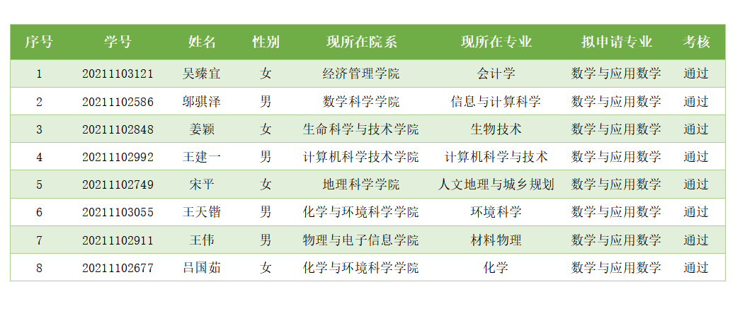 日,学院通过考试、考核,确定拟接收转专业学生名单如下