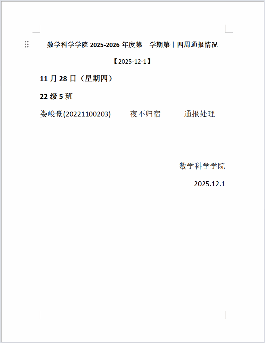 澳门pg官方电子平台2025-2026年度第一学期第十四周通报情况